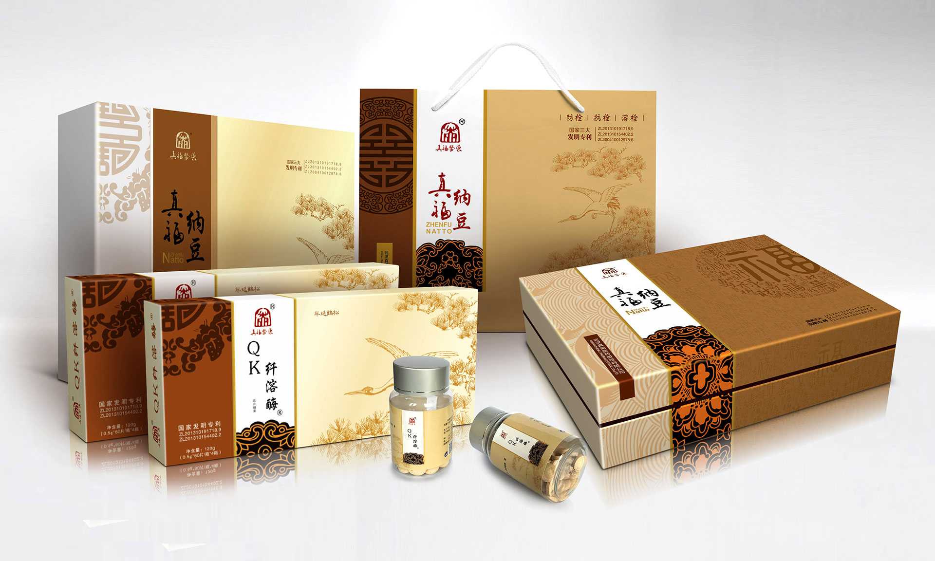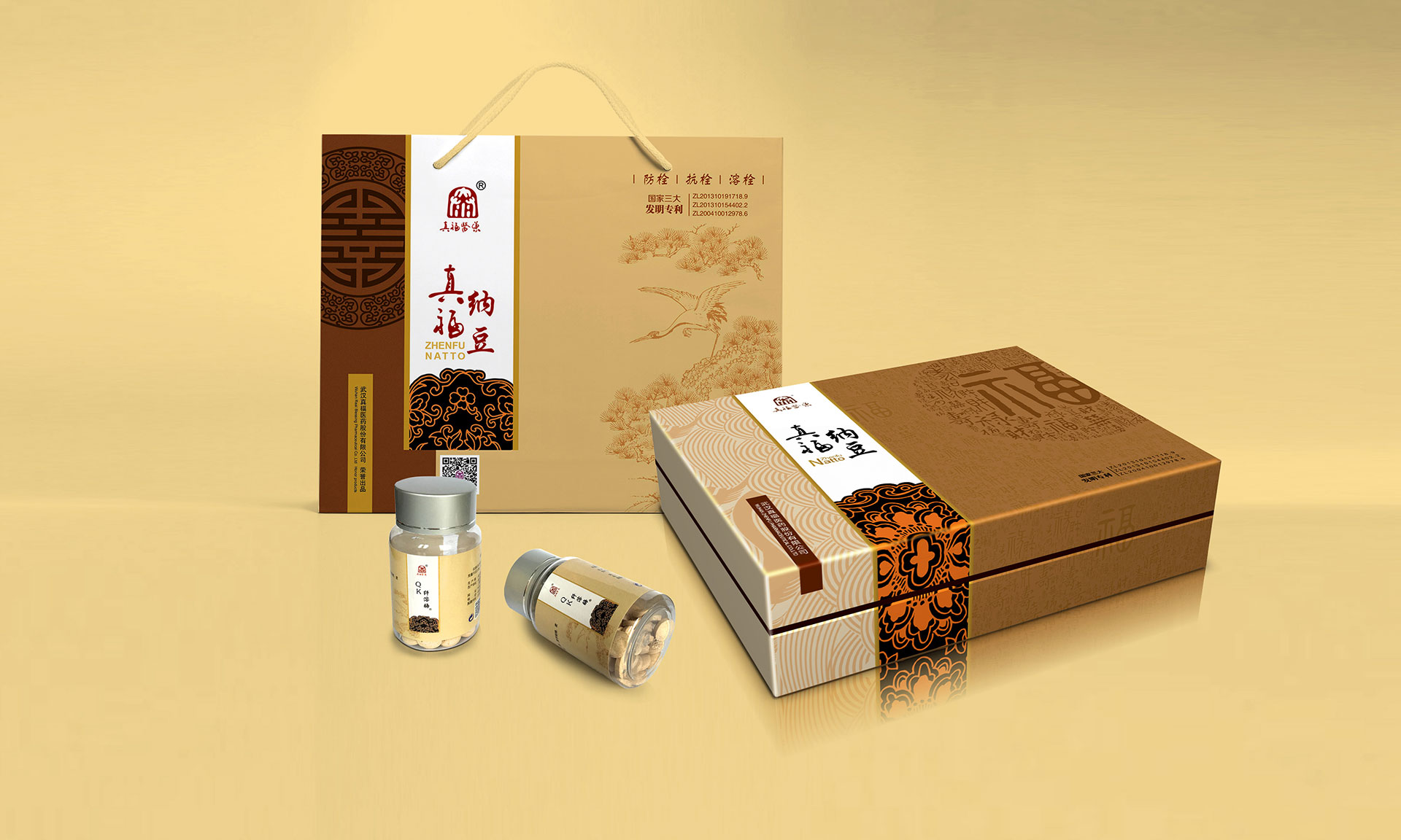 心腦血管疾病是人類健康的頭號殺手,中國人的死亡80%就是心腦管疾病。武漢大學生命科學院通過現代生物技術,在農產品大豆中提煉出枯草桿菌研制成的真福納豆,獲得國家三項發明專利。該產品對緩解和輔助治療心腦血管疾病有著顯著的效果,同時不對人產生任何傷害。是一種綠色健康的產品。信立浩達設計團隊對產品價值深度挖掘,在產品包裝設計上用中國傳統的“福祿壽禧、松鶴延年”文化來表達,同時反復訴求:讓中國人多活十年!這樣產品的價值,通過福壽文化、松鶴文化得到了形象的傳遞,深受中老年人的心理認同。